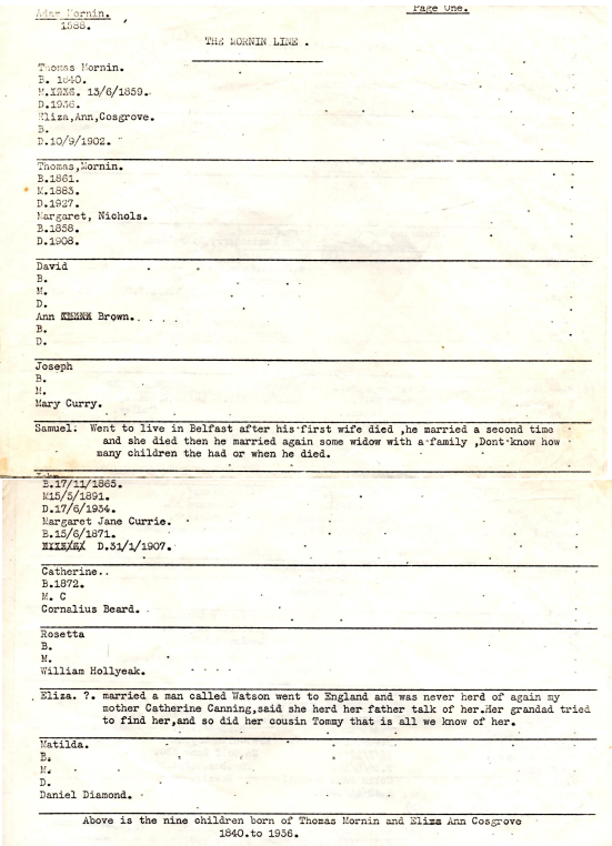 - One-Name Study of the MORNIN surname – continuing my maternal Grandfather’s work on his mother’s family. Searching for a link between 3 known branches and searching for their origins.